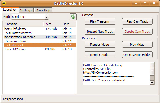 BattleDirector is an application for Battlefield movie directors. It streamlines the moviemaking process by allowing filmmakers to go from BFR to AVI in simple steps. The simple GUI provides all the tools you need with one-click access. The Sir. Community utilizes BattleDirector for all its professional-quality productions.