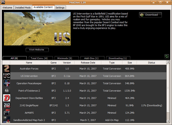 Modjive was an application that allowed users to view and download the latest available modifications for Battlefield 2 and Battlefield 2142. It automatically installed the mods and later updated them for you when new versions were released.